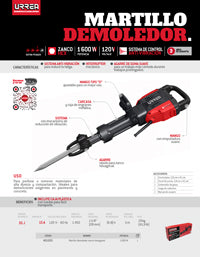 Martillo demoledor con control antivibración, zanco hexagonal 1600W, 120V, 55J, 1450 IPM Urrea